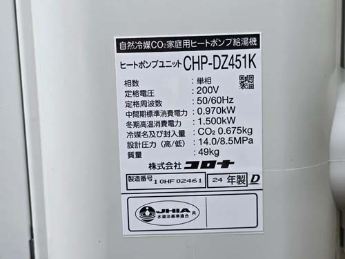 稲沢市牛踏町 コロナエコキュート→コロナ自然冷媒CO2家庭用ヒートポンプ給湯機 ヒートポンプユニットCHP-DZ451K エコキュート交換工事