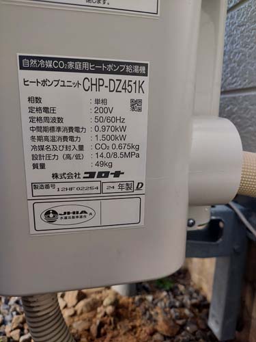 稲沢市牛踏町 コロナ自然冷媒CO2家庭用ヒートポンプ給湯機 ヒートポンプユニットCHP-DZ451K エコキュート交換工事