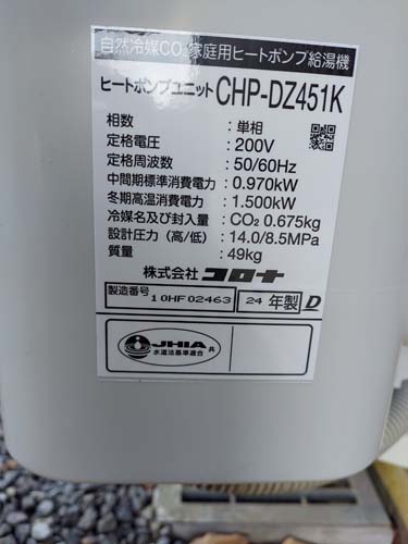 一宮市乾町 コロナ自然冷媒CO2家庭用ヒートポンプ給湯機 ヒートポンプユニットCHP-DZ451K エコキュート交換工事